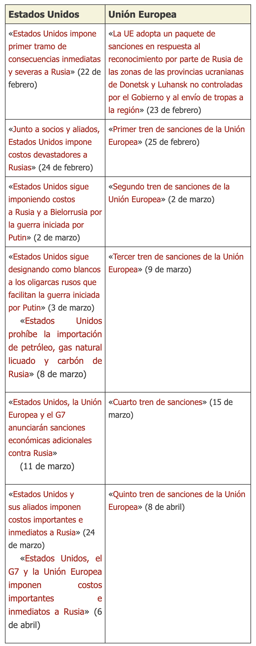 -3. El 3 de marzo Washington comenzó a arremeter contra los millonarios rusos –‎erróneamente llamados «oligarcas»–, los que en realidad aborrecen a Putin, y el 8 de marzo prohibió las ‎importaciones de hidrocarburos rusos. El 9 de marzo, la Unión Europea siguió el paso de ‎Washington contra los millonarios rusos pero se resistió a la orden de prohibir la importación de ‎gas ruso, indispensable para la economía europea. ‎