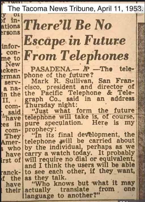 Esta predicción de 1953 ha demostrado ser en gran medida precisa. Ciertamente, los teléfonos modernos son «transportados por el individuo». Los teléfonos también se pueden integrar con relojes inteligentes, realizar videollamadas y proporcionar traducciones casi instantáneas.