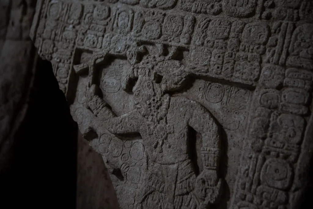Los glifos también destacan la vida de los gobernantes dinásticos, como el deliciosamente llamado K’ab Kante’, incluyendo cuándo murió cada uno, cómo se les conmemoró y en qué circunstancias llegaron sus sucesores al trono. En un glifo, el gobernante Sak Tz’i’ aparece como el Yopaat danzante, una divinidad asociada a las violentas tormentas tropicales. El hacha que lleva en la mano derecha es un rayo, la deidad de los pies de serpiente K’awiil; en la izquierda lleva una “manopla”, un garrote de piedra utilizado en el combate ritual. Se presume que el panel que faltaba mostraba a un prisionero de guerra, arrodillado en súplica a Yopaat.