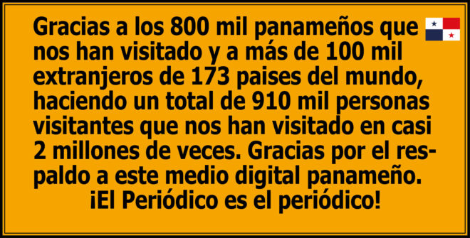 Durante un poco más de dos años de existencia digital, El Periódico de Panamá, ha logrado casi dos millones de visitas de 800 mil panameños y más de 100 mil visitantes extranjeros, que nos privilegian con su encuentro en los análisis que presentamos a través de, la colaboración de decenas de distinguidos intelectuales y profesionales panameños que, producen los más completos análisis de nuestra realidad local y la situación mundial en la política, economía, cultura, y las luchas sociales de los pueblos que creemos en una sociedad justa y de oportunidades para todos.