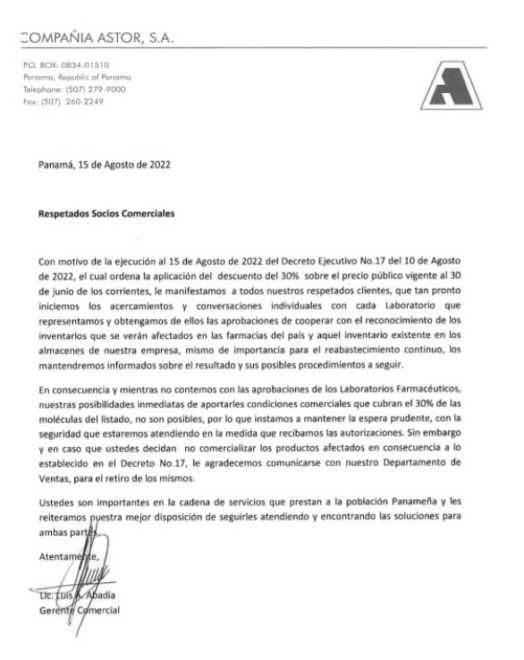 En Un comunicado escueto, aparecido esta mañana en las distintas redes sociales de Panamá, firmado por el Licenciado Luis Abadía, Gerente Comercial del Grupo Astor, que controla las Farmacias Arrocha en todo el territorio nacional, un emporio de la venta de los medicamentos, pero también uno de los distribuidores más grandes del país que, son parte de la gran mafia farmacéutica, se declara en rebeldía y en abierto desacato a las disposiciones legales establecidas, según sus propias palabras que llaman a recoger los medicamentos antes de ponerlos a disposición de los consumidores, exponiendo deliberadamente al pueblo panameño a la inexistencia de sus medicinas porque ellos las recogerían y le quitarían el acceso al público, aquella que están enlistadas dentro del decreto que el gobierno hizo público, una semana atrás.