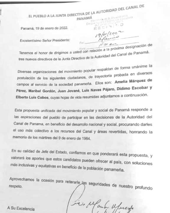 En la mañana de hoy, una delegación representativa de 24 movimientos y organizaciones que respaldan la propuesta popular para integrar la Junta Directiva de la Autoridad del Canal de Panamá, ACP, entregaron en el despacho del presidente de la república una nota remisoria de las propuestas con las hojas de vida de cada uno de los postulados a efectos de que el presidente tenga a bien considerar sus nombres para esta instancia administrativa del mayor interés para los panameños por la trascendencia de sus decisiones. Los postulados son: