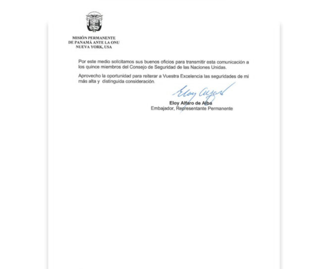 Eloy Alfaro de Alba, el embajador panameño ante la Organización de las Naciones Unidas en Nueva York, en una carta dirigida al Secretario General del Organismo, Antonio Guterres, recordó que, según la Carta fundacional de la ONU, de la que panamá fue signatario en 1945, los países deben abstenerse en sus relaciones internacionales de recurrir a la amenaza o al uso de la fuerza contra la integridad territorial o la independencia política de cualquier Estado.