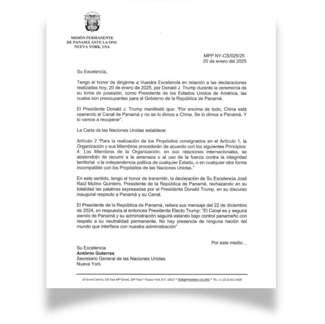 La representación permanente de Panamá envió una carta, sobre las declaraciones del presidente Donald Trump durante su discurso de investidura, cuando prometió que Estados Unidos recuperaría el Canal de Panamá y lo ha reiterado posteriormente.