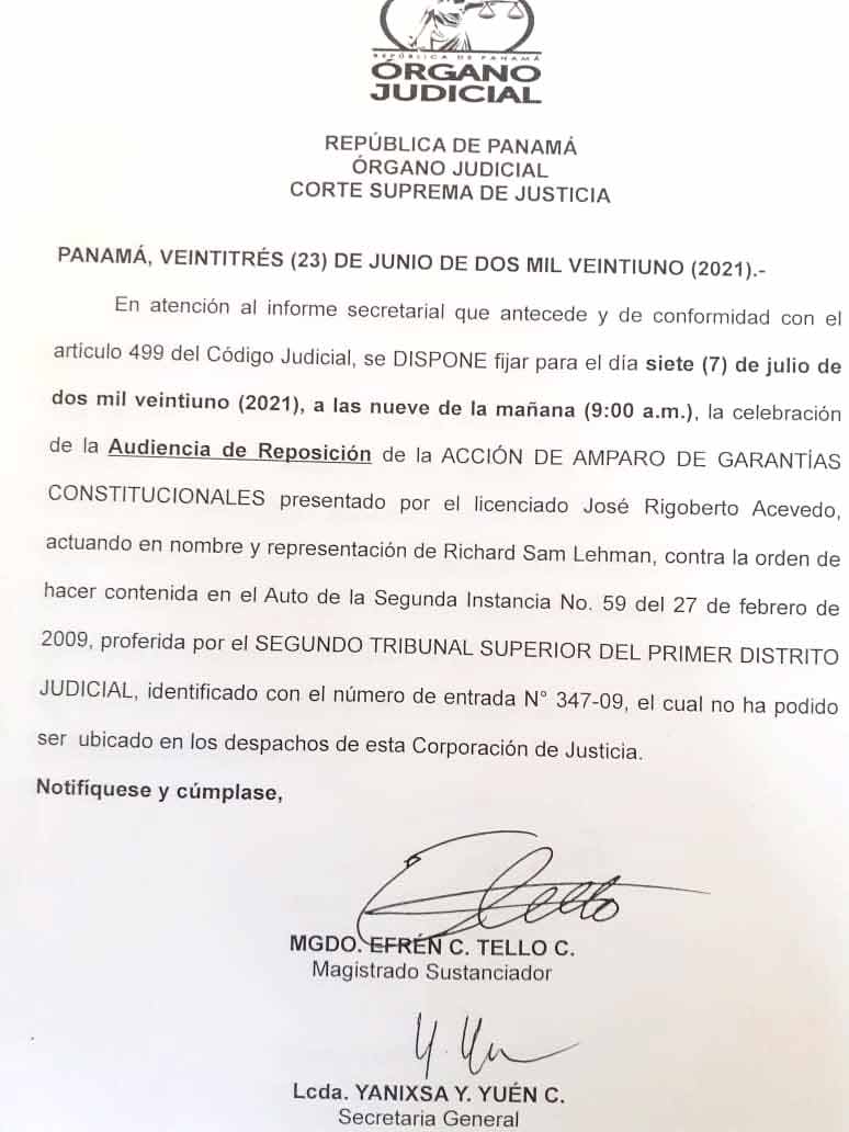 En el año 207 el Juzgado 5 civil emitió un Auto N° 810 de 23 de agosto de 2007, y contra ese proceder ilegal el abogado Víctor Crosbie, en representación de Richard Sam Lehman, presentó una ACCIÓN DE INCONSTITUCIONALIDAD, la cual nunca fue resuelta porque la desaparecieron en la Corte, recuerda que el Magistrado ponente era Oydén Ortega.